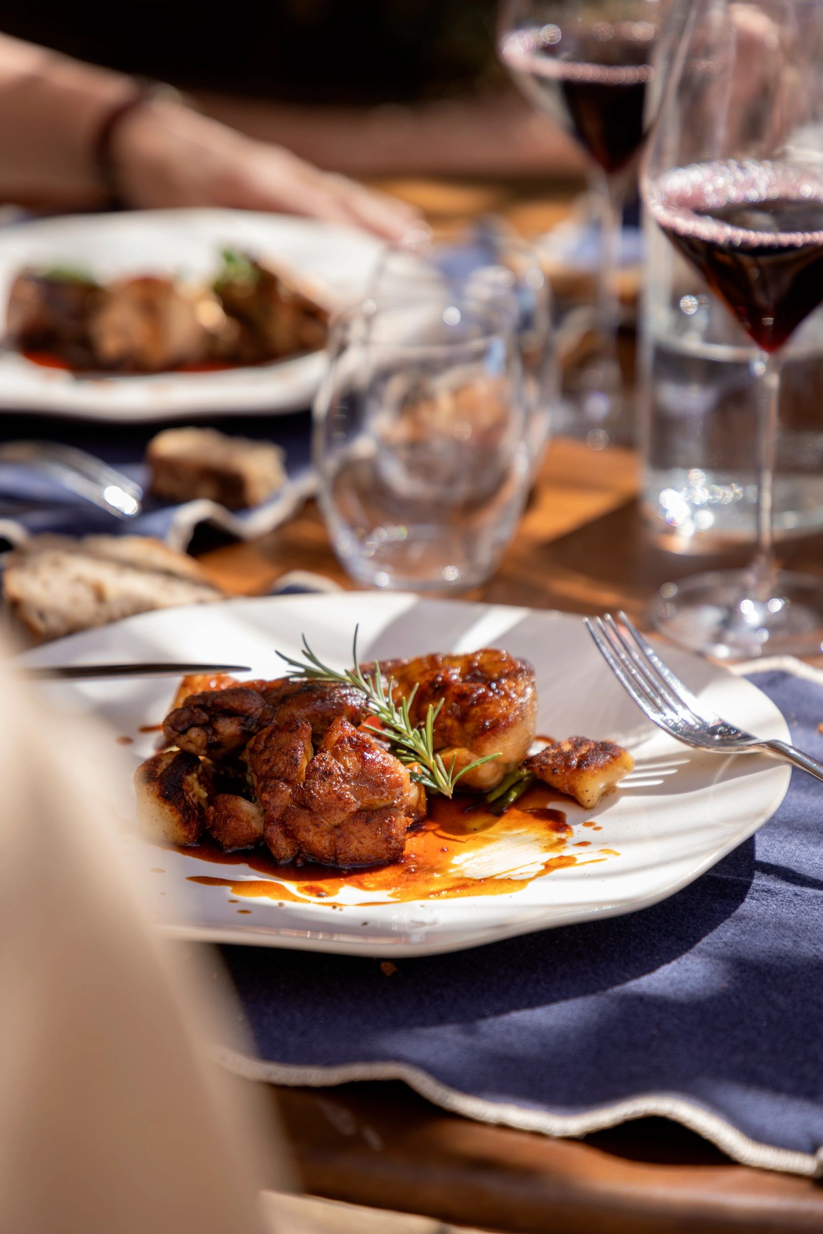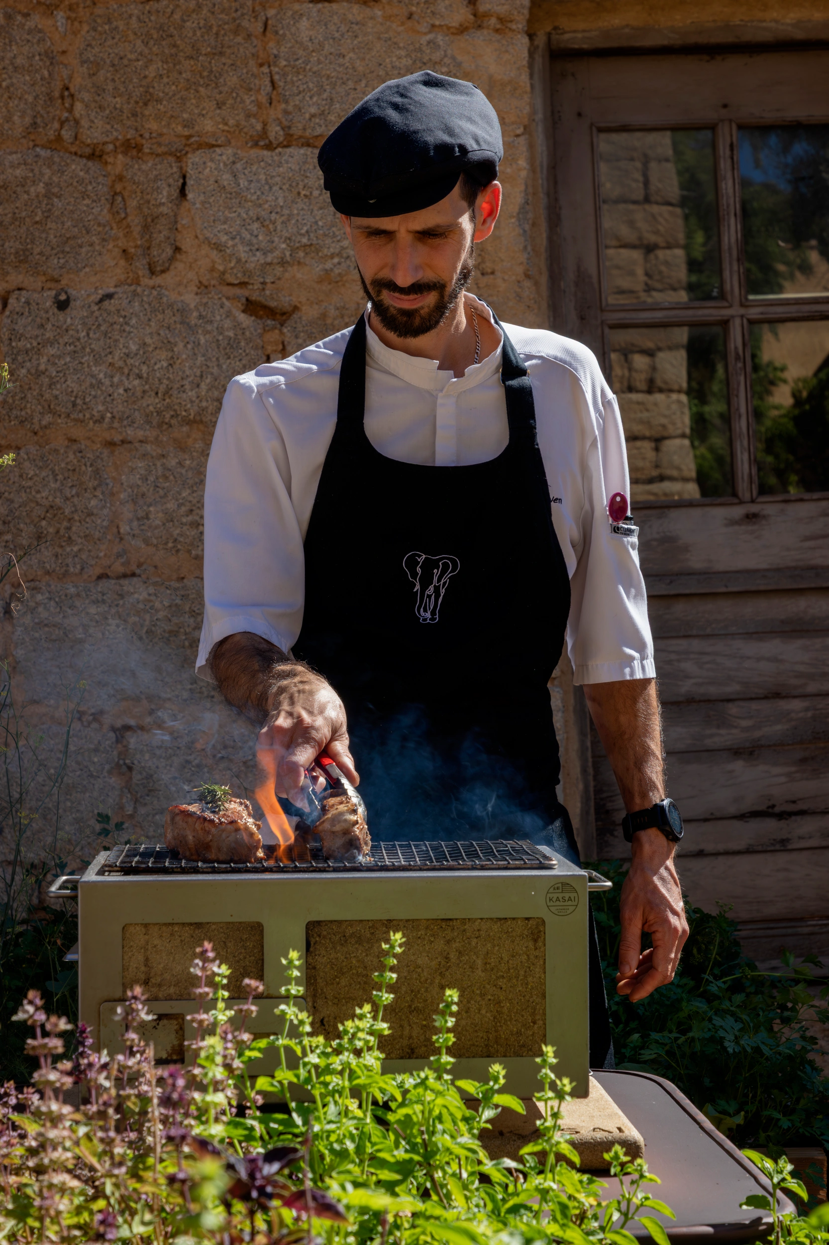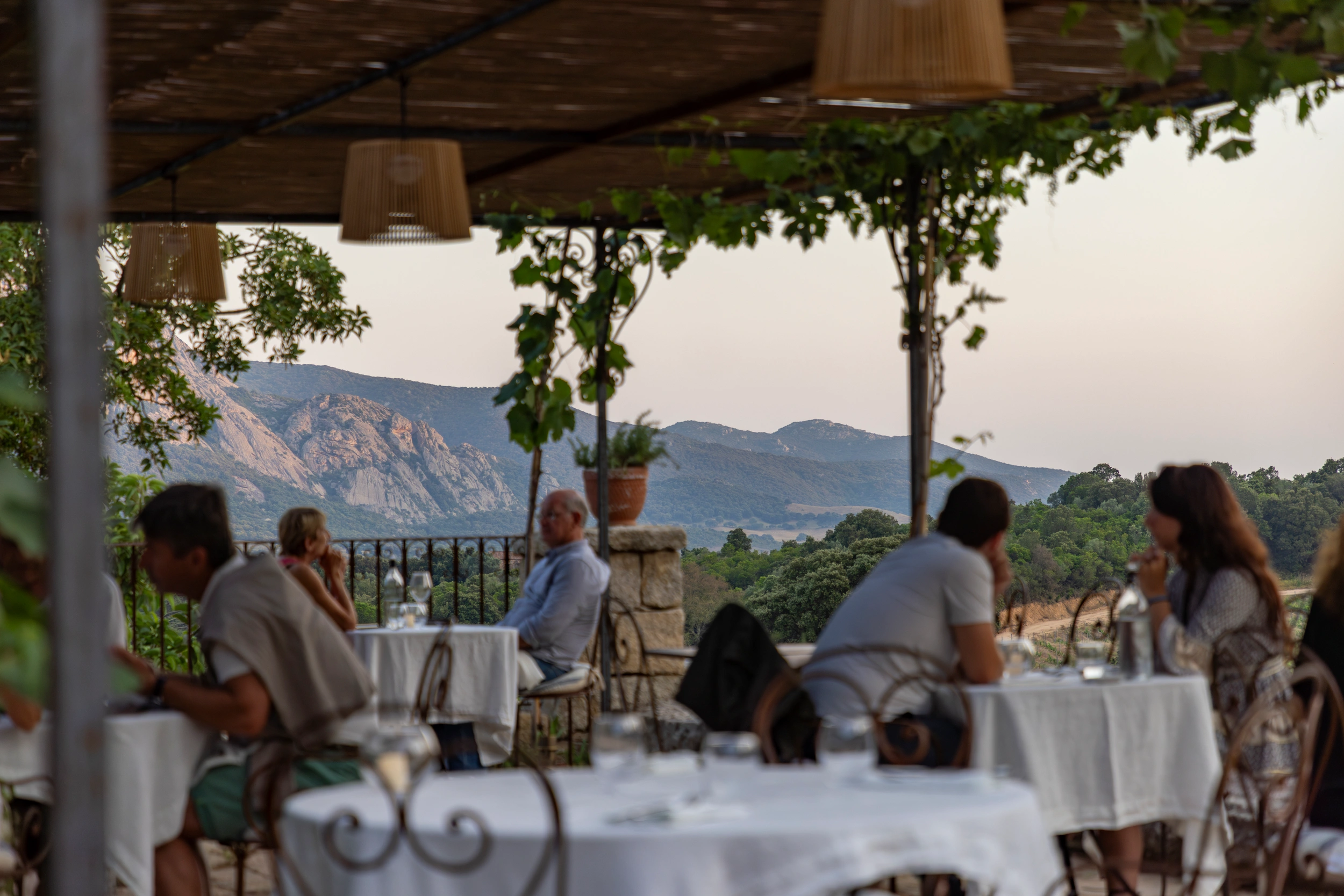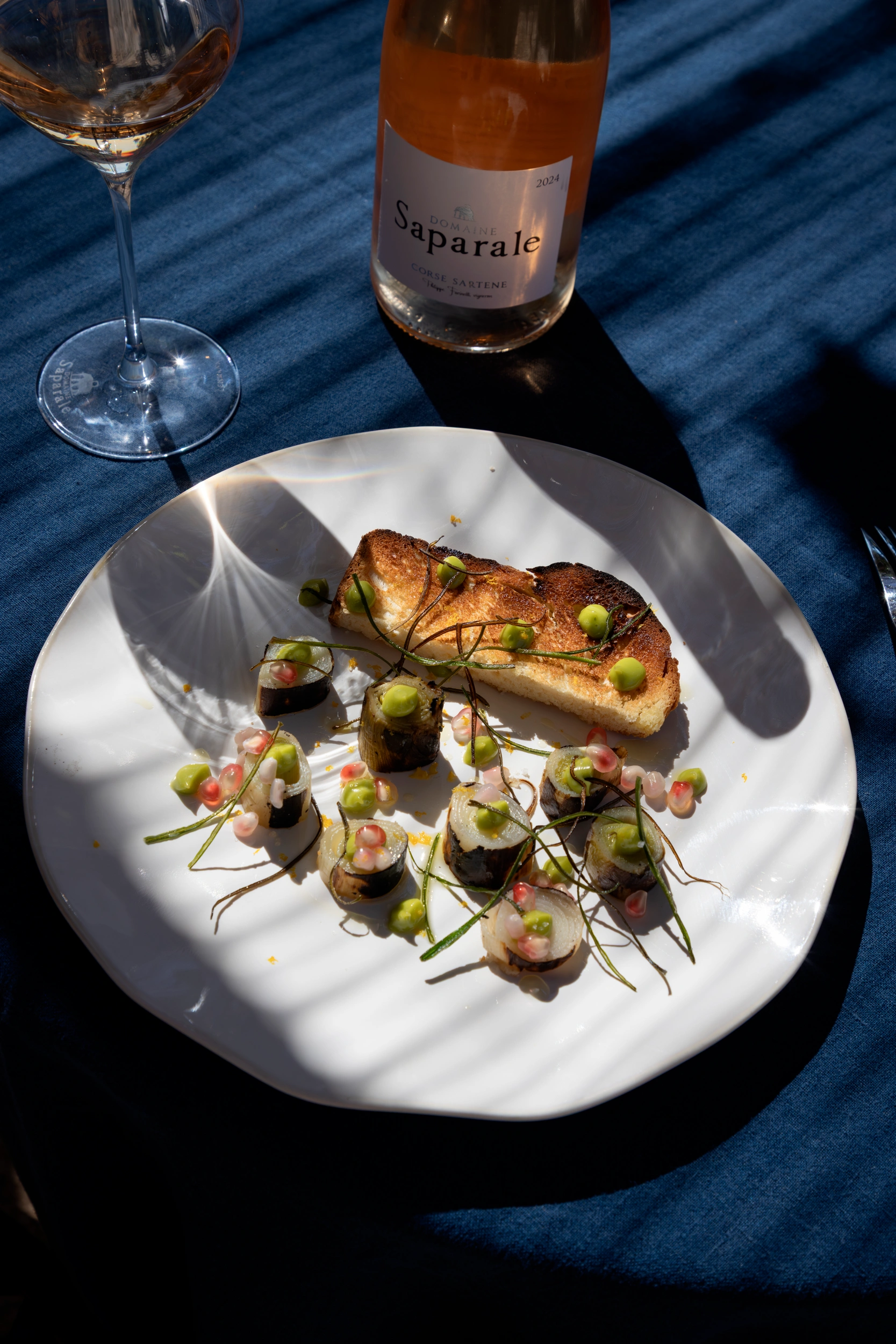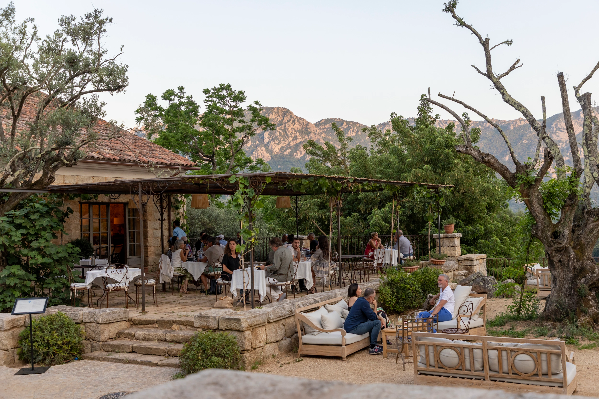 Perché au-dessus du chai, Sopravigna domine la place du hameau et joue la conversation entre pierre, ombre et lumière. À table, la carte suit le tempo du potager et des arrivages alentour : légumes au bon moment, herbes du maquis, poissons de la côte, fromages de producteurs, viandes choisies sans lourdeur. L’écriture est nette, méditerranéenne sans caricature, avec des assiettes qui privilégient la justesse et la gourmandise, puis un dessert qui prolonge les parfums de l’île.