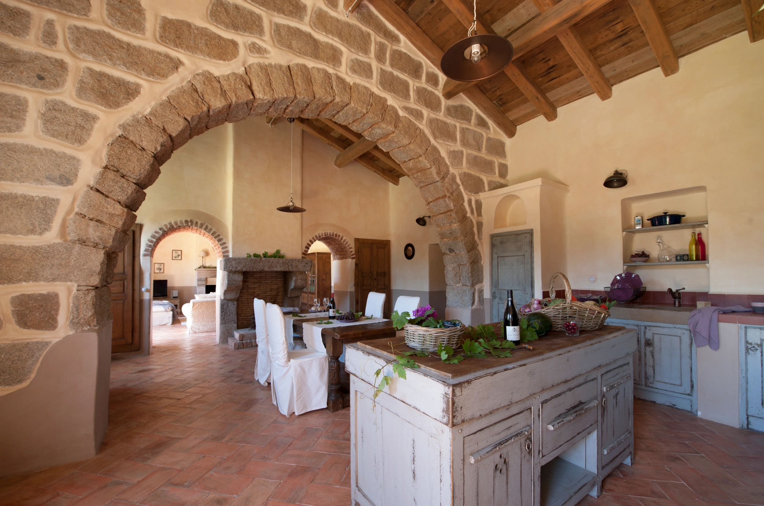3. Salle à manger avec cheminée, ouverte sur une grande cuisine équipée : réfrigérateur-congélateur, fourneau, lave-vaisselle, micro-ondes, petit électroménager.  Buanderie avec lave-linge et sèche-linge. Internet par satellite.